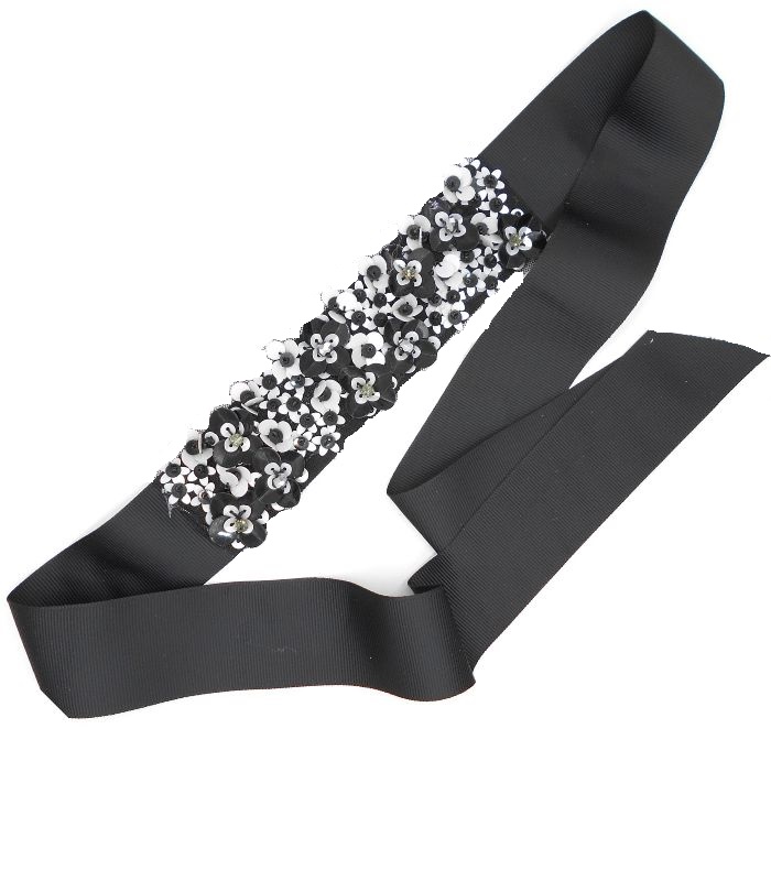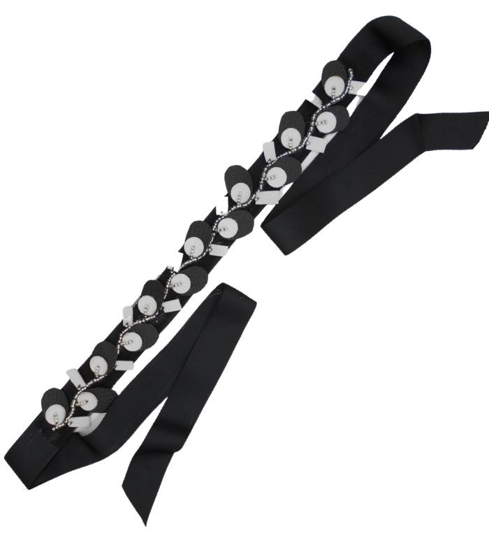 Cod. Art. 78988COL030 cintura grosgrain con foglie ecopelle e perline nero e bianco