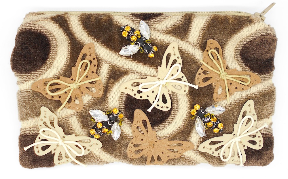 Pochette cm 19×11 velluto devorè, farfalle in suede, api in strass, interno in seta